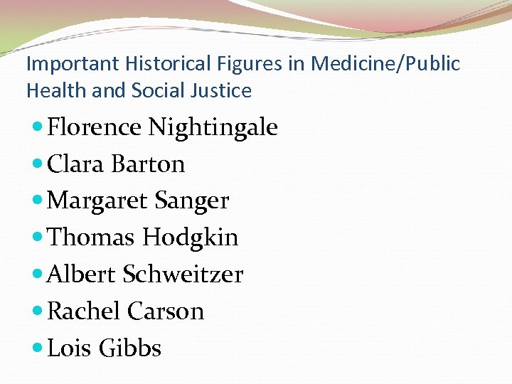 Important Historical Figures in Medicine/Public Health and Social Justice Florence Nightingale Clara Barton Margaret Sanger Thomas Hodgkin Albert Schweitzer Rachel Carson Lois Gibbs