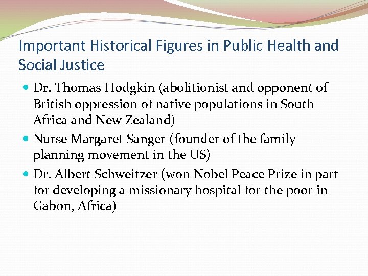 Important Historical Figures in Public Health and Social Justice Dr. Thomas Hodgkin (abolitionist and opponent of British oppression of native populations in South Africa and New Zealand) Nurse Margaret Sanger (founder of the family planning movement in the US) Dr. Albert Schweitzer (won Nobel Peace Prize in part for developing a missionary hospital for the poor in Gabon, Africa)