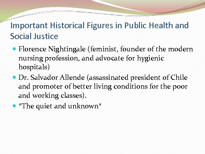 Important Historical Figures in Public Health and Social Justice Florence Nightingale (feminist, founder of the modern nursing profession, and advocate for hygienic hospitals) Dr. Salvador Allende (assassinated president of Chile and promoter of better living conditions for the poor and working classes). *The quiet and unknown*