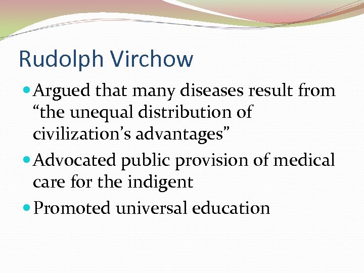Rudolph Virchow Argued that many diseases result from “the unequal distribution of civilization’s advantages” Advocated public provision of medical care for the indigent Promoted universal education