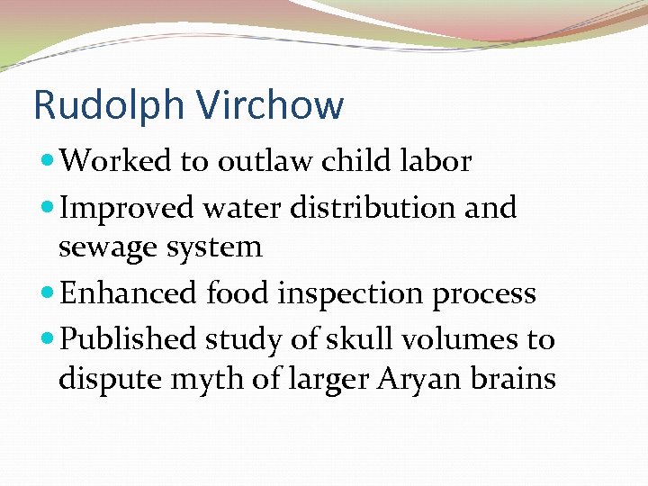 Rudolph Virchow Worked to outlaw child labor Improved water distribution and sewage system Enhanced food inspection process Published study of skull volumes to dispute myth of larger Aryan brains