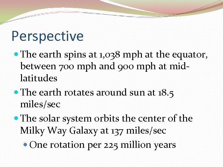 Perspective The earth spins at 1, 038 mph at the equator, between 700 mph and 900 mph at midlatitudes The earth rotates around sun at 18. 5 miles/sec The solar system orbits the center of the Milky Way Galaxy at 137 miles/sec One rotation per 225 million years