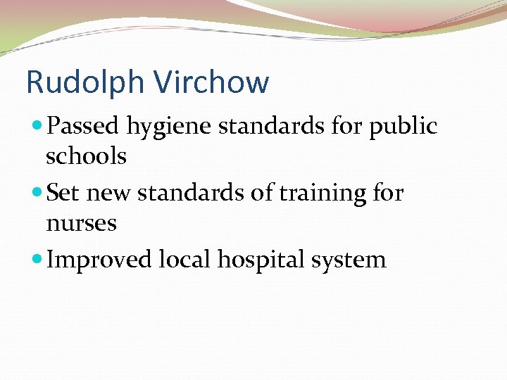 Rudolph Virchow Passed hygiene standards for public schools Set new standards of training for nurses Improved local hospital system