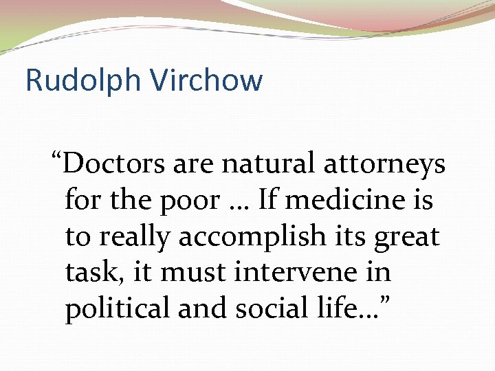 Rudolph Virchow “Doctors are natural attorneys for the poor … If medicine is to really accomplish its great task, it must intervene in political and social life…”
