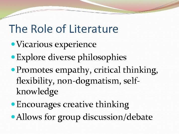 The Role of Literature Vicarious experience Explore diverse philosophies Promotes empathy, critical thinking, flexibility, non-dogmatism, selfknowledge Encourages creative thinking Allows for group discussion/debate