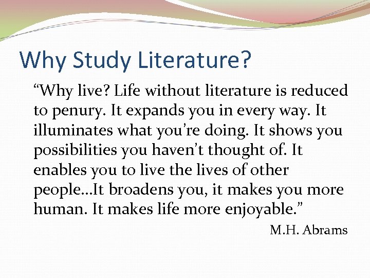 Why Study Literature? “Why live? Life without literature is reduced to penury. It expands you in every way. It illuminates what you’re doing. It shows you possibilities you haven’t thought of. It enables you to live the lives of other people…It broadens you, it makes you more human. It makes life more enjoyable. ” M. H. Abrams