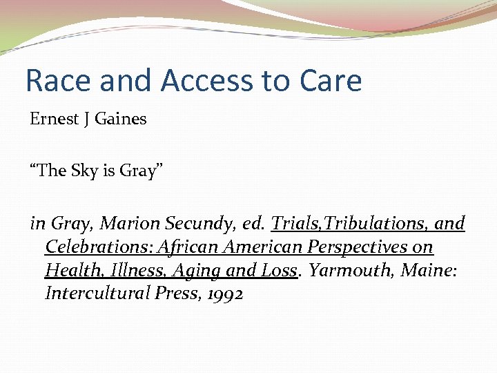 Race and Access to Care Ernest J Gaines “The Sky is Gray” in Gray, Marion Secundy, ed. Trials, Tribulations, and Celebrations: African American Perspectives on Health, Illness, Aging and Loss. Yarmouth, Maine: Intercultural Press, 1992