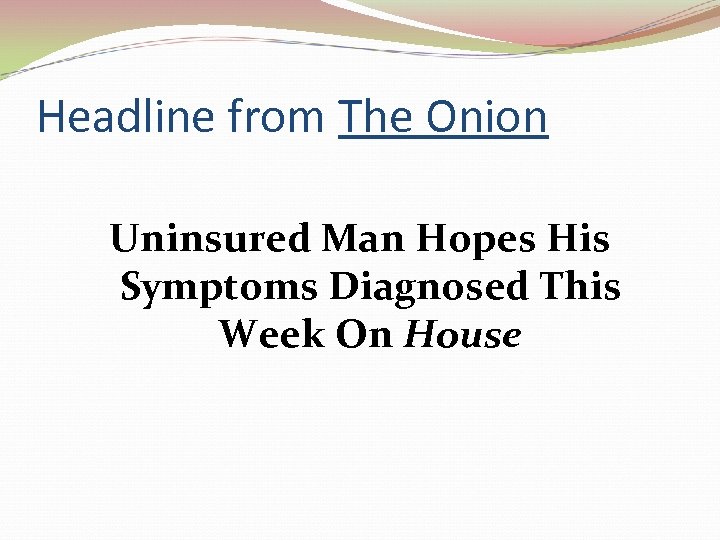 Headline from The Onion Uninsured Man Hopes His Symptoms Diagnosed This Week On House