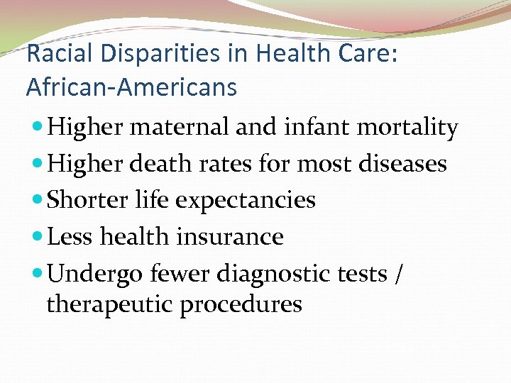 Racial Disparities in Health Care: African-Americans Higher maternal and infant mortality Higher death rates for most diseases Shorter life expectancies Less health insurance Undergo fewer diagnostic tests / therapeutic procedures