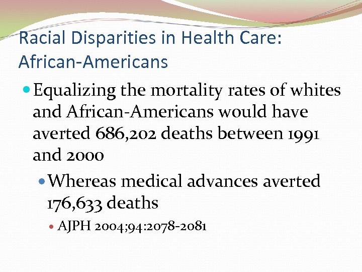 Racial Disparities in Health Care: African-Americans Equalizing the mortality rates of whites and African-Americans would have averted 686, 202 deaths between 1991 and 2000 Whereas medical advances averted 176, 633 deaths AJPH 2004; 94: 2078 -2081