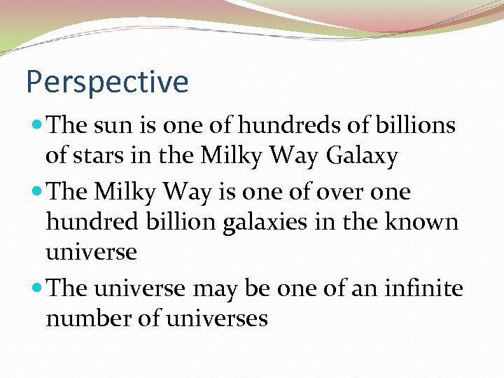 Perspective The sun is one of hundreds of billions of stars in the Milky Way Galaxy The Milky Way is one of over one hundred billion galaxies in the known universe The universe may be one of an infinite number of universes