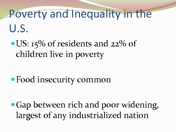 Poverty and Inequality in the U. S. US: 15% of residents and 22% of children live in poverty Food insecurity common Gap between rich and poor widening, largest of any industrialized nation