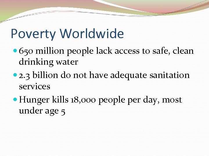 Poverty Worldwide 650 million people lack access to safe, clean drinking water 2. 3 billion do not have adequate sanitation services Hunger kills 18, 000 people per day, most under age 5
