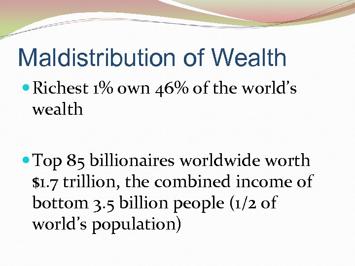 Maldistribution of Wealth Richest 1% own 46% of the world’s wealth Top 85 billionaires worldwide worth $1. 7 trillion, the combined income of bottom 3. 5 billion people (1/2 of world’s population)