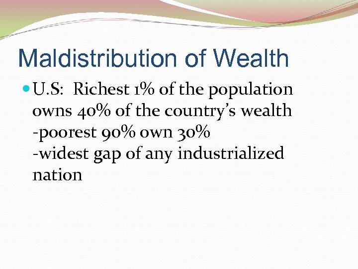 Maldistribution of Wealth U. S: Richest 1% of the population owns 40% of the country’s wealth -poorest 90% own 30% -widest gap of any industrialized nation