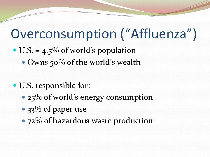 Overconsumption (“Affluenza”) U. S. = 4. 5% of world’s population Owns 50% of the world’s wealth U. S. responsible for: 25% of world’s energy consumption 33% of paper use 72% of hazardous waste production