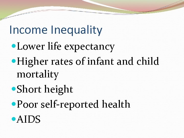 Income Inequality Lower life expectancy Higher rates of infant and child mortality Short height Poor self-reported health AIDS