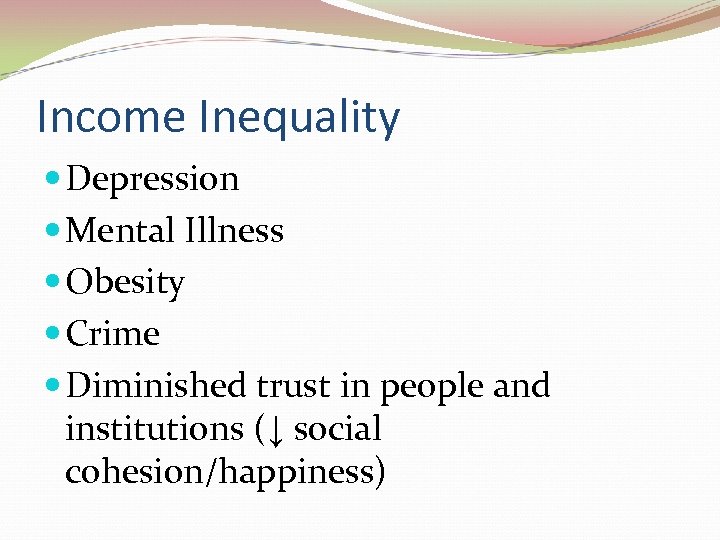 Income Inequality Depression Mental Illness Obesity Crime Diminished trust in people and institutions (↓ social cohesion/happiness)