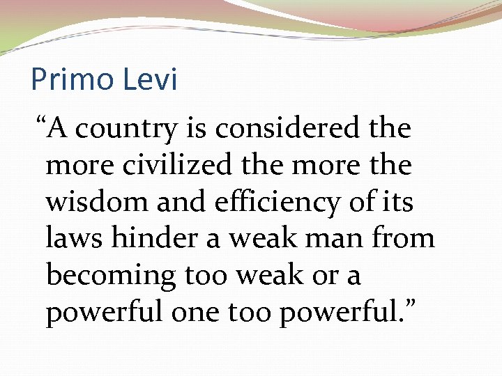 Primo Levi “A country is considered the more civilized the more the wisdom and efficiency of its laws hinder a weak man from becoming too weak or a powerful one too powerful. ”