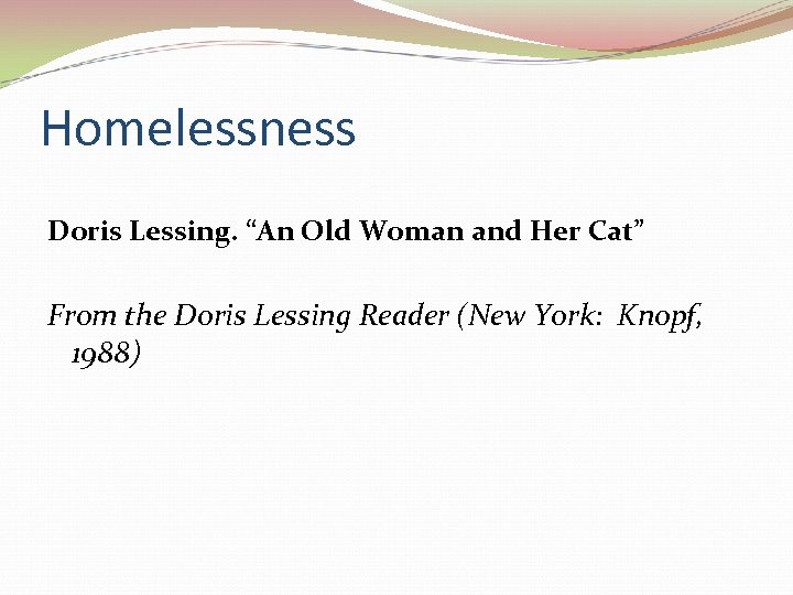 Homelessness Doris Lessing. “An Old Woman and Her Cat” From the Doris Lessing Reader (New York: Knopf, 1988)