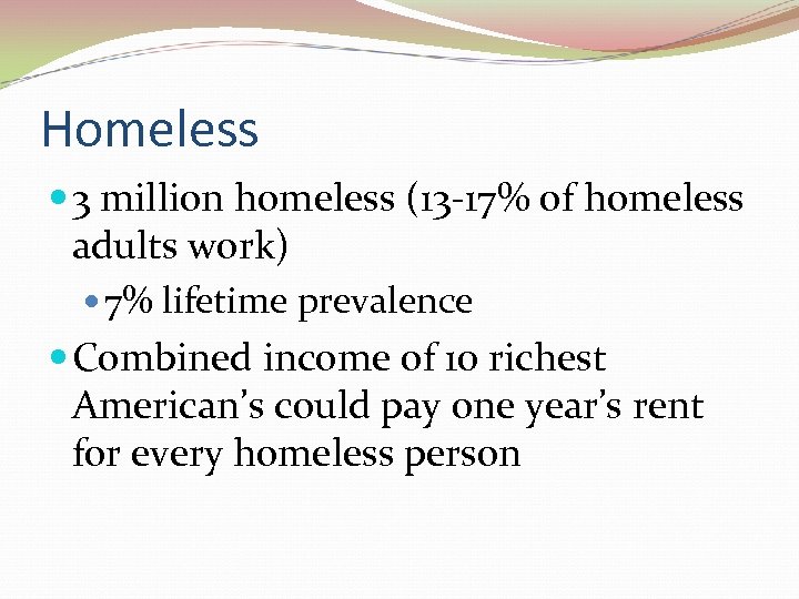 Homeless 3 million homeless (13 -17% of homeless adults work) 7% lifetime prevalence Combined income of 10 richest American’s could pay one year’s rent for every homeless person