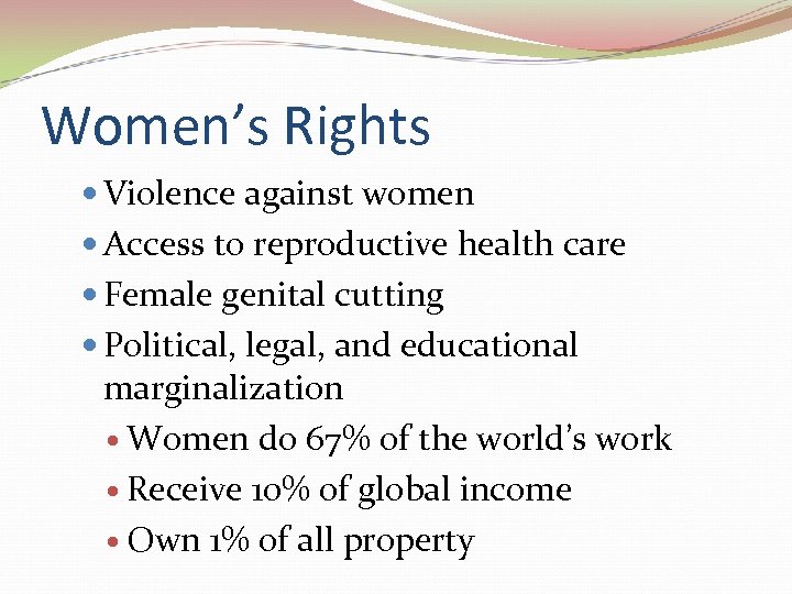 Women’s Rights Violence against women Access to reproductive health care Female genital cutting Political, legal, and educational marginalization Women do 67% of the world’s work Receive 10% of global income Own 1% of all property