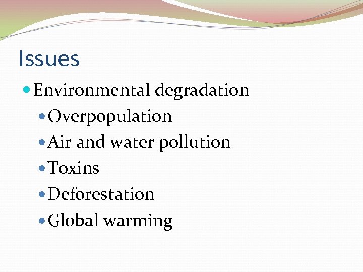 Issues Environmental degradation Overpopulation Air and water pollution Toxins Deforestation Global warming