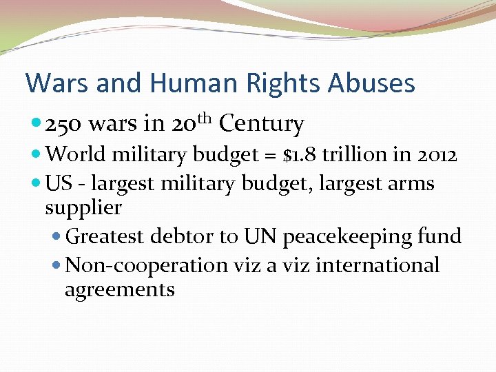 Wars and Human Rights Abuses 250 wars in 20 th Century World military budget = $1. 8 trillion in 2012 US - largest military budget, largest arms supplier Greatest debtor to UN peacekeeping fund Non-cooperation viz a viz international agreements