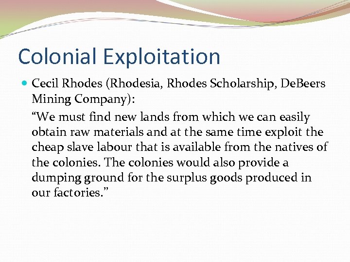 Colonial Exploitation Cecil Rhodes (Rhodesia, Rhodes Scholarship, De. Beers Mining Company): “We must find new lands from which we can easily obtain raw materials and at the same time exploit the cheap slave labour that is available from the natives of the colonies. The colonies would also provide a dumping ground for the surplus goods produced in our factories. ”