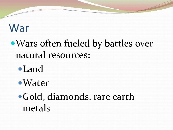 War Wars often fueled by battles over natural resources: Land Water Gold, diamonds, rare earth metals