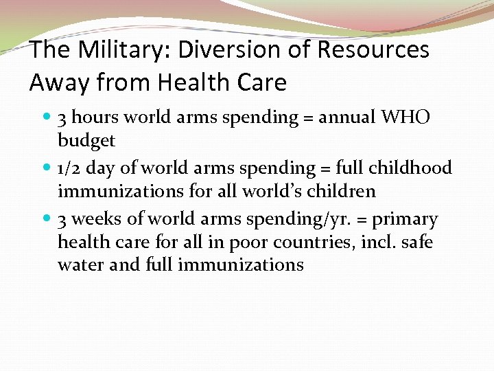 The Military: Diversion of Resources Away from Health Care 3 hours world arms spending = annual WHO budget 1/2 day of world arms spending = full childhood immunizations for all world’s children 3 weeks of world arms spending/yr. = primary health care for all in poor countries, incl. safe water and full immunizations