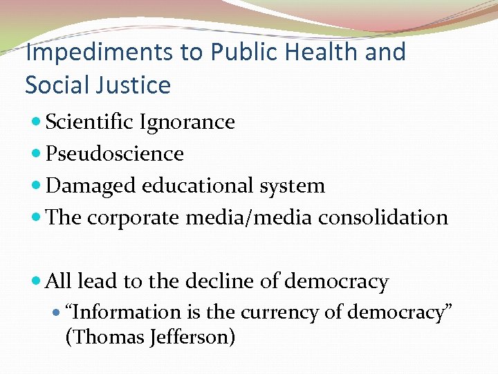 Impediments to Public Health and Social Justice Scientific Ignorance Pseudoscience Damaged educational system The corporate media/media consolidation All lead to the decline of democracy “Information is the currency of democracy” (Thomas Jefferson)