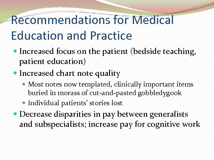 Recommendations for Medical Education and Practice Increased focus on the patient (bedside teaching, patient education) Increased chart note quality Most notes now templated, clinically important items buried in morass of cut-and-pasted gobbledygook Individual patients’ stories lost Decrease disparities in pay between generalists and subspecialists; increase pay for cognitive work