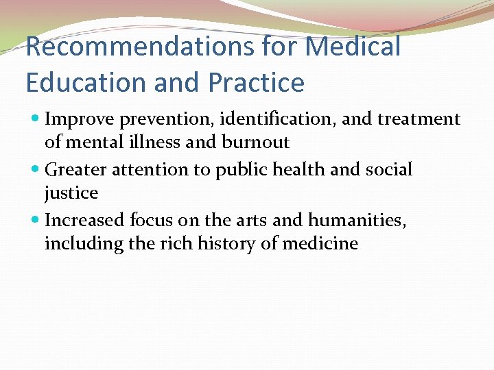 Recommendations for Medical Education and Practice Improve prevention, identification, and treatment of mental illness and burnout Greater attention to public health and social justice Increased focus on the arts and humanities, including the rich history of medicine