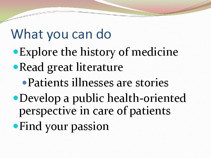 What you can do Explore the history of medicine Read great literature Patients illnesses are stories Develop a public health-oriented perspective in care of patients Find your passion