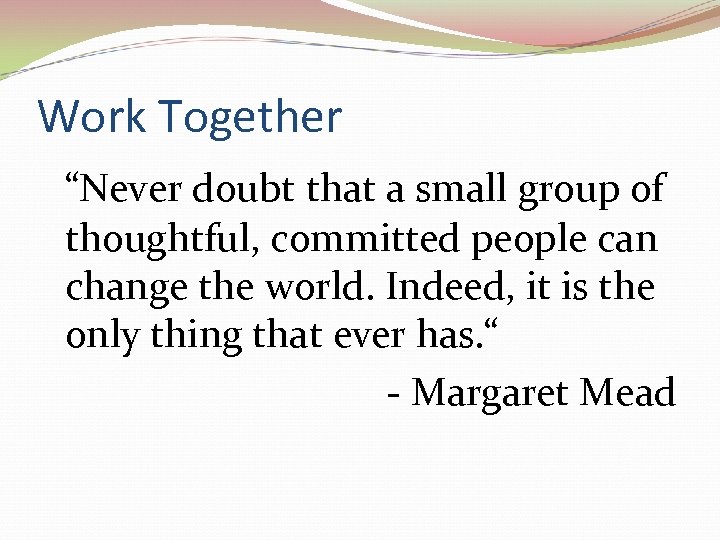 Work Together “Never doubt that a small group of thoughtful, committed people can change the world. Indeed, it is the only thing that ever has. “ - Margaret Mead