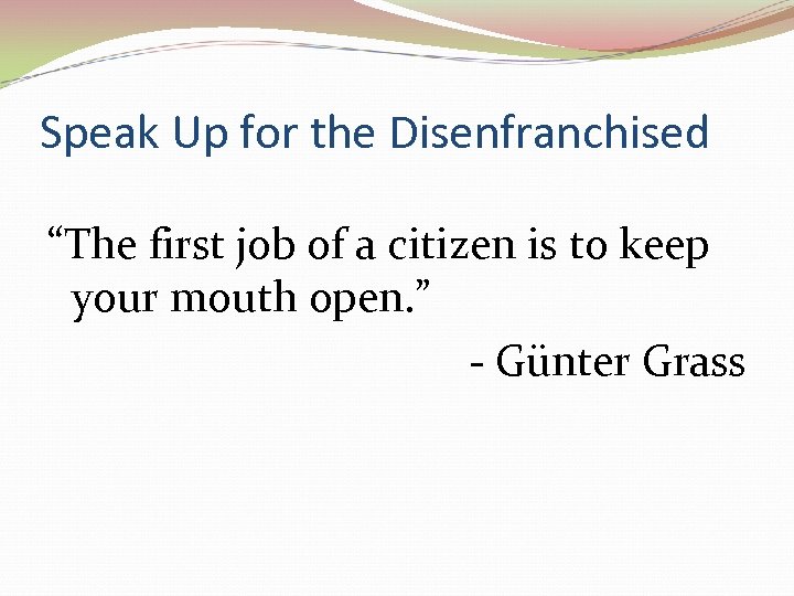 Speak Up for the Disenfranchised “The first job of a citizen is to keep your mouth open. ” - Günter Grass