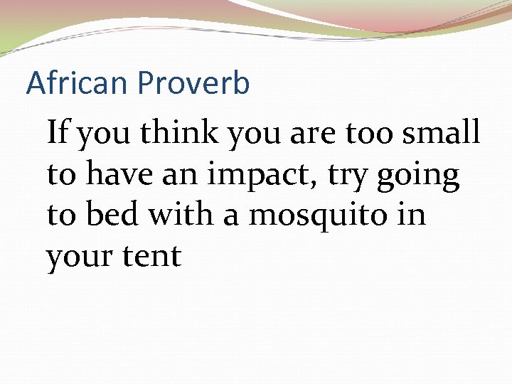 African Proverb If you think you are too small to have an impact, try going to bed with a mosquito in your tent