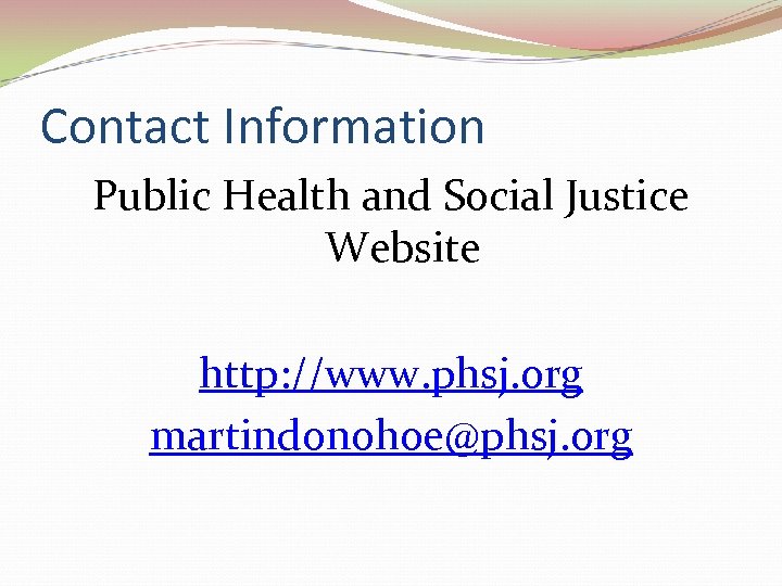 Contact Information Public Health and Social Justice Website http: //www. phsj. org martindonohoe@phsj. org