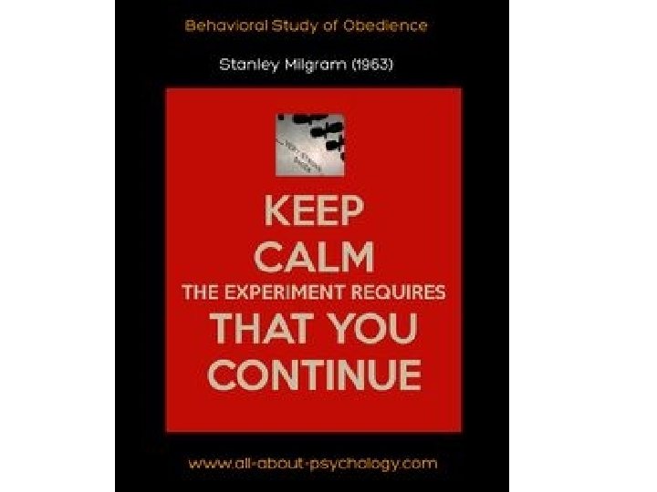 Would You Obey? • You are a freshmen at a major university that is renowned for its psychological research. In response to an ad, you agree to take party in a study on learning. The experimenter instructs you to give the other volunteer subject a word association test. Each time the subject gives the wrong answer you are to administer an electric shock. With each wrong answer, you are to increase the voltage of the shock. After a while, the subject begins to protest. Complaining of pain, he begs you to stop. The experimenter instructs you to continue. Would you obey and continue the experiment? Explain.