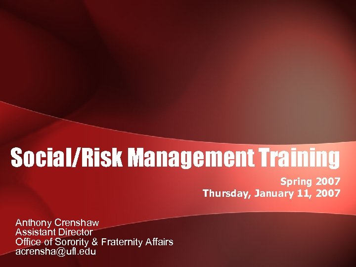 Social/Risk Management Training Spring 2007 Thursday, January 11, 2007 Anthony Crenshaw Assistant Director Office of Sorority & Fraternity Affairs acrensha@ufl. edu