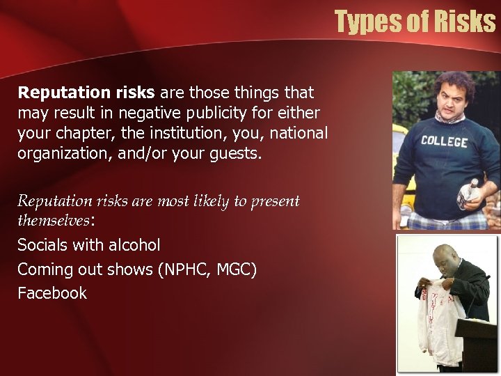 Types of Risks Reputation risks are those things that may result in negative publicity for either your chapter, the institution, you, national organization, and/or your guests. Reputation risks are most likely to present themselves: Socials with alcohol Coming out shows (NPHC, MGC) Facebook