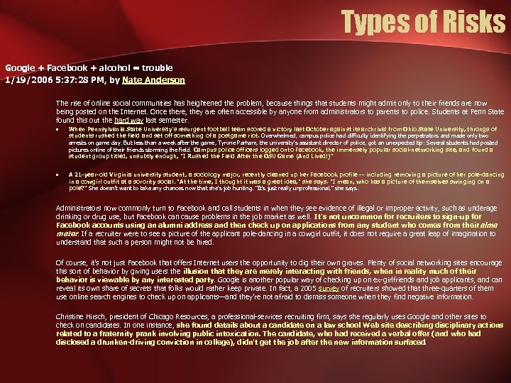 Types of Risks Google + Facebook + alcohol = trouble 1/19/2006 5: 37: 28 PM, by Nate Anderson The rise of online social communities has heightened the problem, because things that students might admit only to their friends are now being posted on the Internet. Once there, they are often accessible by anyone from administrators to parents to police. Students at Penn State found this out the hard way last semester. • When Pennsylvania State University's resurgent football team scored a victory last October against its archrival from Ohio State University, throngs of students rushed the field and set off something of a postgame riot. Overwhelmed, campus police had difficulty identifying the perpetrators and made only two arrests on game day. But less than a week after the game, Tyrone Parham, the university's assistant director of police, got an unexpected tip: Several students had posted pictures online of their friends storming the field. Campus police officers logged onto Facebook, the immensely popular social-networking site, and found a student group titled, unsubtly enough, "I Rushed the Field After the OSU Game (And Lived!)“ • A 21 -year-old Virginia university student, a sociology major, recently cleaned up her Facebook profile -- including removing a picture of her pole-dancing in a cowgirl outfit at a sorority social. "At the time, I thought it was a great idea, " she says. "I mean, who has a picture of themselves swinging on a pole? “ She doesn't want to take any chances now that she's job hunting. "It's just really unprofessional, " she says. Administrators now commonly turn to Facebook and call students in when they see evidence of illegal or improper activity, such as underage drinking or drug use, but Facebook can cause problems in the job market as well. It's not uncommon for recruiters to sign-up for Facebook accounts using an alumni address and then check up on applications from any student who comes from their alma mater. If a recruiter were to see a picture of the applicant pole-dancing in a cowgirl outfit, it does not require a great leap of imagination to understand that such a person might not be hired. Of course, it's not just Facebook that offers Internet users the opportunity to dig their own graves. Plenty of social networking sites encourage this sort of behavior by giving users the illusion that they are merely interacting with friends, when in reality much of their behavior is viewable by any interested party. Google is another popular way of checking up on ex-girlfriends and job applicants, and can reveal its own share of secrets that folks would rather keep private. In fact, a 2005 survey of recruiters showed that three-quarters of them use online search engines to check up on applicants—and they're not afraid to dismiss someone when they find negative information. Christine Hirsch, president of Chicago Resources, a professional-services recruiting firm, says she regularly uses Google and other sites to check on candidates. In one instance, she found details about a candidate on a law school Web site describing disciplinary actions related to a fraternity prank involving public intoxication. The candidate, who had received a verbal offer (and who had disclosed a drunken-driving conviction in college), didn't get the job after the new information surfaced.