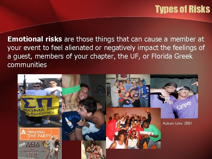 Types of Risks Emotional risks are those things that can cause a member at your event to feel alienated or negatively impact the feelings of a guest, members of your chapter, the UF, or Florida Greek communities Auburn Univ, 2001