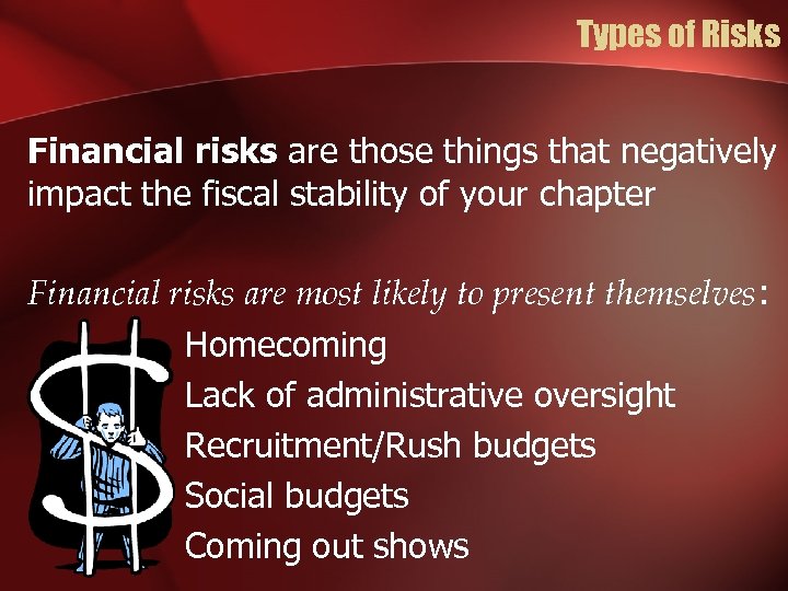 Types of Risks Financial risks are those things that negatively impact the fiscal stability of your chapter Financial risks are most likely to present themselves: Homecoming Lack of administrative oversight Recruitment/Rush budgets Social budgets Coming out shows