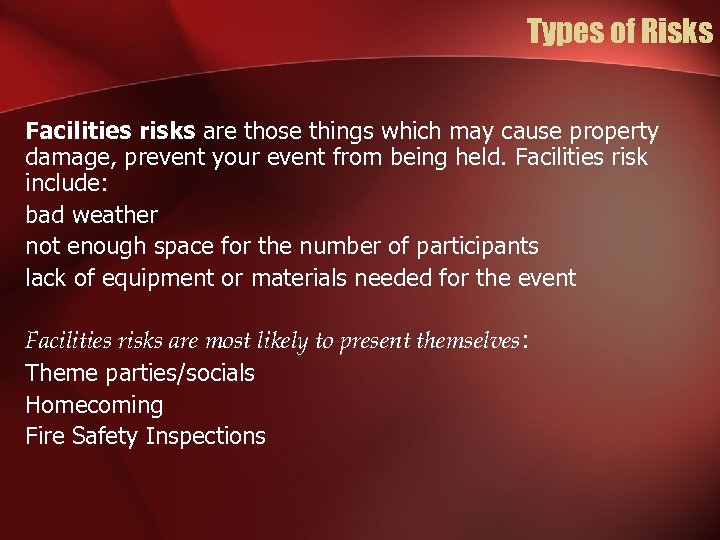 Types of Risks Facilities risks are those things which may cause property damage, prevent your event from being held. Facilities risk include: bad weather not enough space for the number of participants lack of equipment or materials needed for the event Facilities risks are most likely to present themselves: Theme parties/socials Homecoming Fire Safety Inspections