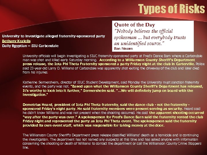 Types of Risks University to investigate alleged fraternity-sponsored party Bethany Krajelis Daily Egyptian – SIU Carbondale Quote of the Day "Nobody believes the official spokesman. . . but everybody trusts an unidentified source. " Ron Nessen University officials will begin investigating a SIUC fraternity-sponsored party at Fred's Dance Barn where a Carbondale man was shot and killed early Saturday morning. According to a Williamson County Sheriff's Department press release, the Iota Phi Theta Fraternity sponsored a party Friday night at the club in Carterville. Police said 23 -year-old Larry D. Williams of Carbondale was apparently shot exiting the driveway of the club and later died from his injuries. Katherine Sermersheim, director of SIUC Student Development, said Monday the University must sanction fraternity events, and the party was not. "Based upon what the Williamson County Sheriff's Department has released, It's worthy to look into it further, " Sermersheim said. ". . . We will definitely jump on board with the investigation. " Demetrius Heard, president of Iota Phi Theta fraternity, said the dance club - not the fraternity sponsored Friday's night party. He said fraternity members were present serving as security. Heard said he didn't know Williams and was not present when the shooting occurred. He said the apparent shooting occurred "way after the party was over. " A spokesperson for Fred's Dance Barn said the fraternity rented the club Friday night and represented the party as Iota Phi Theta event. The spokesperson said the fraternity provided its own event staff, which was responsible for taking money at the door. The Williamson County Sheriff's Department press release classified Williams' death as a homicide and is continuing the investigation. The department has not named any suspects at this time and has asked anyone with information concerning the shooting or death of Williams to contact the department or call the Williamson County Crime Stoppers line.
