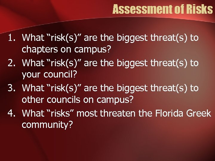 Assessment of Risks 1. What “risk(s)” are the biggest threat(s) to chapters on campus? 2. What “risk(s)” are the biggest threat(s) to your council? 3. What “risk(s)” are the biggest threat(s) to other councils on campus? 4. What “risks” most threaten the Florida Greek community?