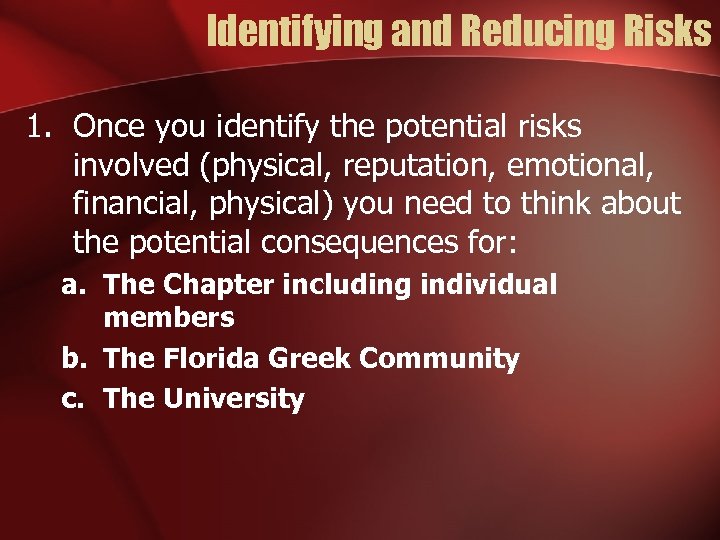 Identifying and Reducing Risks 1. Once you identify the potential risks involved (physical, reputation, emotional, financial, physical) you need to think about the potential consequences for: a. The Chapter including individual members b. The Florida Greek Community c. The University