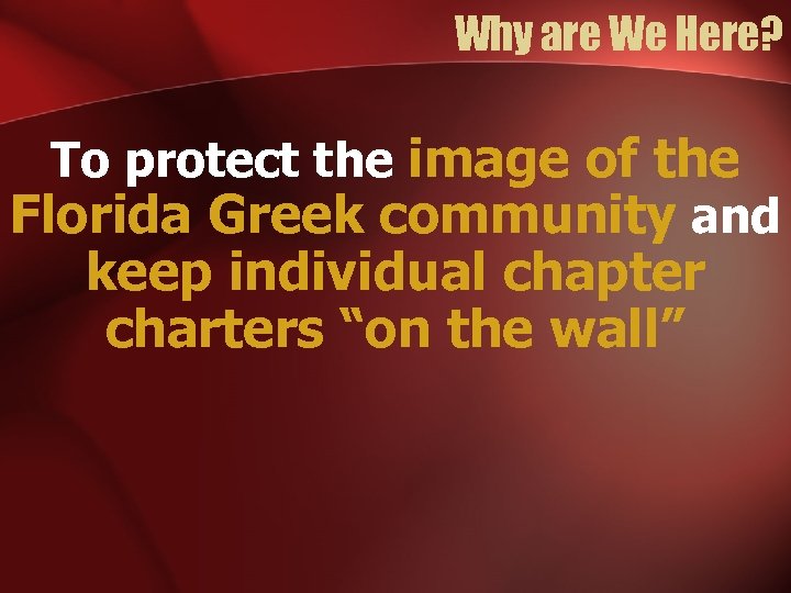 Why are We Here? To protect the image of the Florida Greek community and keep individual chapter charters “on the wall”